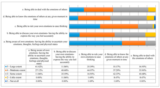 This section of the study analyses the strength of the respondents’ emotional dispositions based on each of the key success factors of emotional intelligence in the workplace. This was measured using a five-point scale with these descriptors: 5–Large extent, 4–Moderate extent, 3–Some extent, 2–Little extent and 1–Not at all. The frequency distribution of the respondents’ emotional dispositions as derived across the 124 oil and gas professionals is shown in Figure 3. ‘Being aware of one’s own emotions’, which means ‘having the ability to ascertain your emotions, thoughts, feelings and physical states’ had the highest percentage of the rating scale of ‘5–large extent’, with a value of 61.02%. This was succeeded by ‘Being able to rule one’s own emotions to facilitate thinking’, with a value of 35.59% under the rating scale of ‘5–large extent’. Under the rating of ‘4–moderate extent’, ‘Being able to rule one’s own emotions to facilitate thinking’ led with a value of 44.07%. This study shows that the emotional dispositions of the majority of oil and gas professionals are more predominant in the following key factors of emotional intelligence: ‘Being aware of one’s own emotions’ and ‘Being able to rule one’s own emotions to facilitate thinking’.