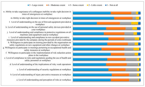 The extent to which the respondents’ emotional dispositions affect their commitment to each of the key success factors of occupational health and safety was derived from the survey questionnaire. The oil and gas professionals were asked to indicate the extent to which their emotional intelligence affected their commitment to each of the key success factors of occupational health and safety management in their workplaces. Their responses were collected using a five-point scale with the following descriptors: 5–Large extent, 4–Moderate extent, 3–Some extent, 2–Little extent and 1–Not at all. The frequency distributions are presented in Figure 4. The study showed that the ‘Ability to make the correct decision in times of emergencies in the workplace’ was rated the highest by the participants, with a value of 61.02%. This was followed by ‘Level of understanding of injury preventive measures in the workplace’, with a value of 57.63%. A significant observation from the ratings placed on the extent to which workers’ emotional intelligence affected their commitment to each of the key success factors was the allocation of a rating of 55.93% across three of them. These factors include: