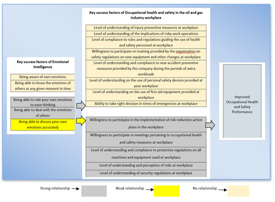 This finding indicates that among the five identified key factors of emotional intelligence, only three have the capability to improve occupational health and safety performance in the oil and gas industry, with ‘Being able to deal with the emotions of others’ having the highest impact. This entails that the employees’ awareness of their own emotions and their recognition of the emotions of others does not have any impact on improving occupational health and safety, unless the employees are able to deal with them. Therefore, for oil and gas industry employees to be able to deal with the emotions of others, they will need to be able to rule their own emotions to facilitate thinking and act accordingly (0.761 > 0.25). Out of the 14 key success factors of occupational health and safety in the workplace, only 6 were found to be affected by emotional intelligence, as shown in Figure 5. These included the following: