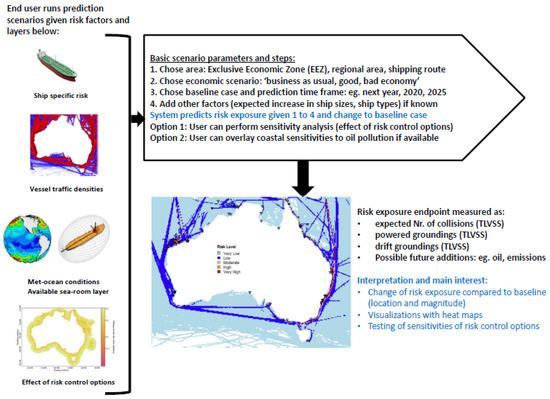 Maritime regulators, port authorities, and industry require the ability to predict risk exposure of shipping activities at a micro and macro level to optimize asset allocation and to mitigate and prevent incidents. This article introduces the concept of a strategic planning tool by making use of the multi-layered risk estimation framework (MLREF), which accounts for ship specific risk, vessel traffic densities, and meets ocean conditions at the macro level. This article’s main contribution is to provide a traffic and risk exposure prediction routine that allows the traffic forecast to be distributed across the shipping route network to allow for predicting scenarios at the macro level (e.g., covering larger geographic areas) and micro level (e.g., passage way, particular route of interest). In addition, the micro level is introduced by providing a theoretical idea to integrate location specific spatial rate ratios along with the effect of the risk control option to perform sensitivity analysis of risk exposure prediction scenarios. Aspects of the risk exposure estimation routine were tested via a pilot study for the Australian region using a comprehensive and unique combination of datasets. Sources of uncertainties for risk assessments are described in general and discussed along with the potential for future developments and improvements.