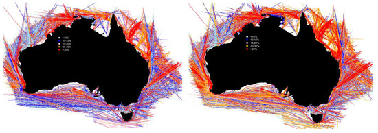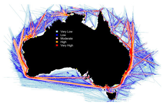 The categories used in Figure 2 and Figure 3 to classify the risk levels are very low to very high. The thresholds were based on providing a roughly equal number of grid areas for the ‘moderate’, ‘high’, and ‘very high’ categories. All of the remaining grid areas defining the study area were then allocated to very low and low risk. The expected numbers of events appear very low since the associated area size (of a grid) is also very small (~3 nm2). These maps provide an indication of hot spots across a large area such as the whole Australian EEZ since it provides the visualization of the risk areas in addition to calculated figures, such as expected numbers of incidents.