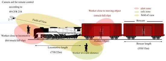 Cameras in yards are crucial to monitor switching and coupling operations. In Figure 1, the reference of remote control operation for switching and coupling has been shown. A Remote Control Operator (RCO) is responsible for switching and coupling railcars in yards. To do this, the RCOs have to be close to the railcars and control the locomotive in sync with their own actions [,]. However, this also places them in close proximity to moving trains. Therefore, in order to improve the safety of the RCOs, protective devices should be installed in yards. It has been clearly mentioned how remote control zone or remote control operation should be maintained in 218.99(b)(3)(i). If any action is not safe or not confirmed as safe, there should be an immediate halt on all EoD action. Therefore, vision-based sensors should provide real-time information and visual confirmation to the remote personnel about failure or success of detection, classification, and tracking of the current action of the EoDs on site. The process should not hinder line-of-sight of the remote EoD or encumber them in any way.
