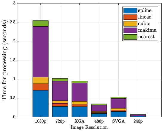 Therefore, through this algorithm, we suggest adopting a flexible mode of image processing by selecting resolution and calibration. Based on our test cases, we have found that 60–70% of the time we don’t require our camera to output at HD resolution in order to reliable detect objects. Even if the camera may be set to capture 720p or 1080p images, our multi-sensor approach can direct processing to focus on a specific subsection of the image for classification. For example, if we use sound localization or ultrasonic detectors to detect an EoD in the environment at 60 angle, we can extract only 0–60 or 60–90 portion of the image and process with our algorithms. If we use ensemble processing time to calculate the frame rate of the images with our algorithm, we can easily find that, from one 1080p image, we can have six partitions of 240p images. Therefore, we can significantly improve real-time performance of image classification. The average latency thus is reduced to multiples of 0.0132 s in our test setup, as shown in Table 3 and Figure 2 and Figure 3. For multiple objects, we can remove the partitions where no object is present to remove additional burden on processing. For example, in Figure 4, Figure 5 and Figure 6, there are no cars or objects in the middle. Each of these sequential steps provide us the opportunity to optimize delay, processing time without compromising classification. Figure 2 shows different processing time for different interpolation methods. For each partitioned or full image, the calibrated values of and with interpolation method are found. These values are used for real-time processing of the images that can vary in size from 240p to 480p.