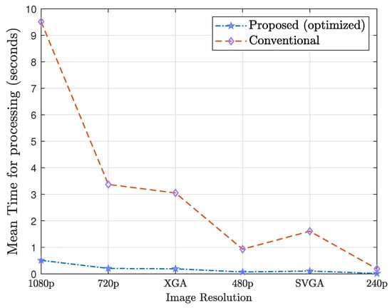Mean time to process for conventional vs. proposed algorithm for image processing.