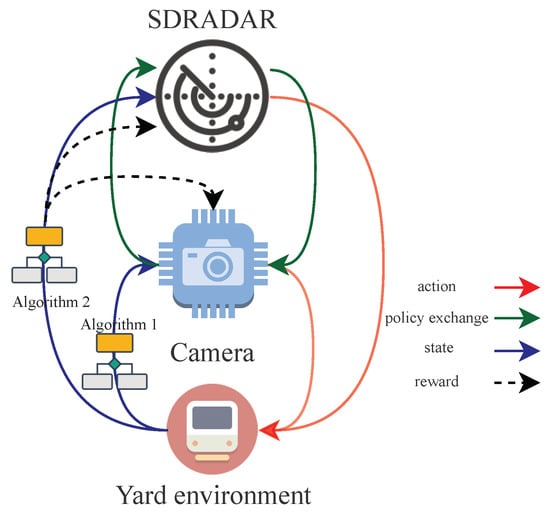 As we discuss later the process of using software-defined RADAR system, we illustrate the binding methodology for different sensors. In our multi-sensor model, software defined radar acts as a primary sensor, where it learns from the yard environment to detect and track EoD quickly and accurately. In our previous section, we have shown how vision-based sensors can be used as a standalone or secondary sensor to alleviate the risk of false-positive while detecting railyard personnel. Therefore, calibrating the secondary sensor based on the information collected by the primary sensor is shown here as reinforcement learning. In Figure 7, it is illustrated that information collected from primary sensors can be used to better the result of secondary sensor, which in turn provide advantages such as exact intervals when the clutter information to be collected. The clutter information is a knowledge unwanted returns collected from the environment while collecting target returns. Clutter information can be collected during regular time intervals or when there is significant environmental changes. A secondary sensor can easily provide sudden temporal or spatial change in the environment. During the fusion of primary and secondary sensors, we have used policies and different states to accomplish accurate detection and tracking while optimizing primary and secondary sensor performance in terms of power consumption and real-time latency in EoD detection. In this section, we first discuss how the information flow is handled between algorithms and how there are are actions associated with primary and secondary sensors during different states.