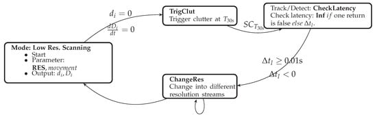The primary sensor being SDRADAR, the states it can attain is always power on mode, whereas the camera can operate both power on and low power modes. During low power modes or states, the actions of the camera are (1) observe the environment for movement, (2) detect EoD and heavy rolling object/locomotive, (3) change resolution based on the number of activity, (4) receive feedback from RADAR to decide on re-calibration, and (5) trigger RADAR for clutter information collection. Figure 7 suggests the reward from the yard environment to be collected by the sensors. Most of the time, in our algorithm, the reward is zero. However, the positive reward is fed to the sensors when the latency deviation between RADAR and camera detection of EoD in a scene is less than ms during each action defined before. Therefore, we define the camera resolution and trigger clutter data collection in 30 s intervals as shown in Figure 8. In Figure 8, is the distance of EoD from the camera and is the locomotive, rolling stocks, etc. In the state flow diagram, is scene or clutter information to be collected at or 30 s intervals. The check latency state would compare between time to detect EoDs in different sensors. If the value is negative, there is no EoD found. If one camera provides a negative and another positive value, the camera will change resolution until it finds the EoD in its point of view (POV). If the camera fails to detect the EoD in POV, the detection and tracking will still work with primary sensor or SDRADAR data. However, if the latency is greater than 0.01 s, the camera will also change to lower resolution to find EoD in POV. Based on the latency values, the resolution can be changed as shown in the state flow diagram and this camera algorithm acquires the required flexibility. It also articulates the reinforcement learning through reward and maintaining states of operation.