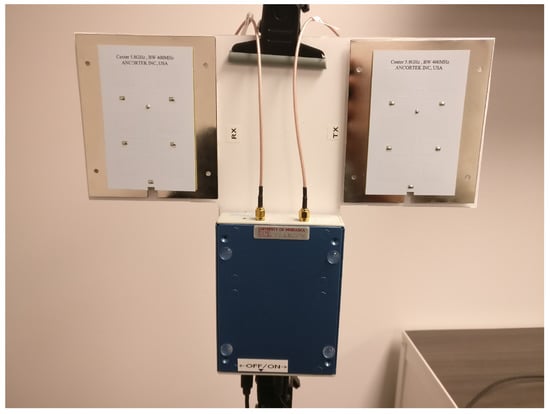 Some of the more fundamental parameters that are automatically configurable in SDRADAR systems are the utilized waveform type, filter configuration, sampling points, sweep time, and bandwidth. The hardware we have used in this study is Ancortek’s SDR-Kit-580AD (VA, USA) []. The kit operates on a 5V power supply and provides separate transmit and receive antennas, as shown in Figure 9, which also shows the housing and mainboard equipped with a SDR-PM 402 processor to be used in C-band frequencies (4–8 GHz), including the ISM band at 5.725–5.875 GHz. More details about the features of SDR580AD can be found in Table 4.