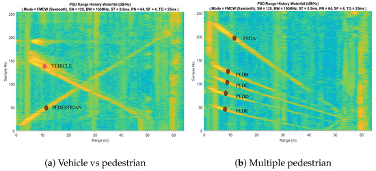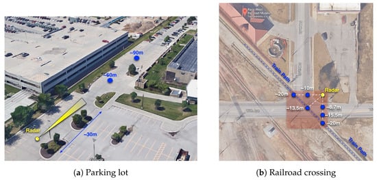 Utilizing the above configuration, we created several test scenarios for multiple pedestrians and pedestrian vs. vehicle detection and tracking in the parking lot test environment, as shown in Figure 12a,b. The clutter environment, as shown by the satellite image, is mostly controlled and static in this environment, with just a few parked vehicles in the vicinity of the test setup. However, the SDRADAR also is able to detect ground reflections and trees in the vicinity, along with the parked cars. Our test scenario shows that, with the proposed variable scanning algorithm, the cars and pedestrian are separable by their returns. As observable in Figure 12a, it is obvious that a car exhibits a larger return compared to the pedestrian. In this example, we can clearly observe a car and a pedestrian approaching each other, passing one another, and then moving away from each other, with a maximum separation of ∼60 m at the end of the test. This illustrates that the simultaneous tracking and classification of these objects using our approach and the SDRADAR works well. A special point of interest is the point where they pass each other, with the pedestrian’s return being overshadowed temporarily by the car’s radar return. In a railyard situation, this is similar to a ‘near-miss’ event and should trigger an alarm with accompanying full recording for documentation including timestamps and visual data, radar information, etc. In Figure 12b, all pedestrians start walking from different starting positions and at different speeds and approach the SDRADAR. Upon closer inspection, we can observe that there is a varying radar return captured in this information shown in Figure 12b, with the stronger return or reflection stemming from the slower pedestrians, whereas the faster pedestrians have a weaker return. This observation provides us the opportunity to work with the return pattern of the objects moving at different speed to further classify and label observed objects.