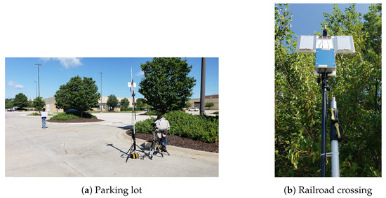 The first set of tests have been run in the parking lot of our University’s Scott Technology Center and at a railroad crossing near the RailsWest Museum in Council Bluffs, IA. The maps in Figure 11a,b shown is used for detection of Figure 12a,b with setups depicted in Figure 13a,b.