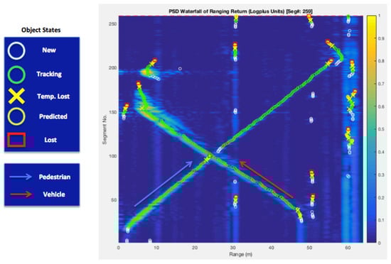 From the map in Figure 11a, we can observe three blue markers at 30 m, 60 m and 90 m within the test setup. These markers represent three different maximum ranges derived from different SDRADAR configurations and they trigger scanning in different regions based on successful or unsuccessful target detection. With variable range resolution and bandwidth configurability, along with adjustable sweep times, it is possible to flexibly and intelligently scan different areas for maximizing the change to detect object at different distances. Utilizing the SDRADAR data, we implemented an object following solution, to label and track objects over time, including when they enter and exit shadowed areas behind larger objects, for example, or cross paths, as shown in Figure 14. The visualization in this image is directly produced from the raw data from the “Car and Pedestrian” test scenario shown in Figure 12a. It can be seen that the car and pedestrian can be tracked over the test period. The labels in Figure 14 are (i) new, (ii) tracking, (iii) temporarily lost, (iv) predicted and (v) lost. When our proposed algorithm finds the first instance of an objects, it identifies it as a new object and starts tracking. Most of the “temporarily lost” labels occur within the ‘point of contact’ region due to object shadowing.