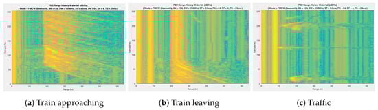 Figure 15 is radar returns for train approaching and departing scenarios shown in Figure 16 show the train approaching and departing scenarios. During our study of the train departure, the train stopped for 30 s providing us ample opportunity to record signal return from the railcars. For the train approach scenario, the locomotive provided a stronger signal spread for SDRADAR to register due to train approaching from 60 m to 20 m. At a measured distance of 15–20 m, thus being relatively close to the SDRADAR, we can see that the very strong radar cross section results in a very broad return signal visualization, as seen in Figure 15a. If, during that time, an object would be at close to the same distance, it would be effectively hidden from view because it would be indistinguishable from the radar cross section of the locomotive. Hence, for our object tracking algorithm, it is vital to be able to continuously update its hypothesis about where tracked objects are, even if they temporarily are overshadowed by larger objects, and to support this hypothesis from other sensors through our multi-sensor approach. If in this example scenario an EoD would be close to a train and in the range of a camera, we would be able to reliably track and distinguish both train and EoD even if the EoD stays within that shadow for long periods of time.