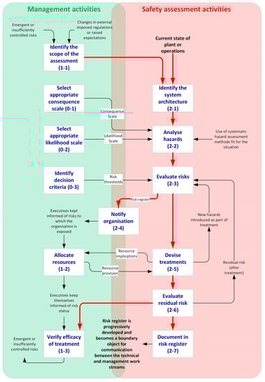 In the H&S application the assessment is consistent with the ISO 31000 approach of partitioning the risk into consequence and likelihood, i.e., those are considered orthogonal. The processes are: identify risks, analyse risks; evaluate risks (quantitative and qualitative methods are available); and treat risks. Those who are interested in a fuller discussion of the treatment of risk, including other options that may be useful at design-time, are referred to the risk management literature. Suitable starting points for risk management generally are ISO 31000 [1], HB436 [2], and for technology risks in particular AS3931 [3] or the equivalent international standards.