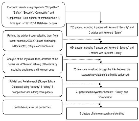 The initial data of search results using “safety” and “security” as the keywords in coopetition-related studies yielded few papers. To refine the number of papers for the presentable sample for further in-depth screening, an advanced search via Publish and Perish (Google Scholar Database) was performed using the keywords “coopetition”, “safety”, “security”. Among the results (around 1000 sources), relevant papers were selected (not books, conference papers or editors’ notes) according to these main criteria: (1) high citation index, (2) abstract, title and keywords must be in accordance with the relevance of the search. The search results ended with data where papers were different in terms of citation (from 812 citations per paper to 0), which can be divided as follows: the first 13 results had more than 100 citations, the second cohort of 15 papers had a citation index more than 50, and so on. After eliminating books, conference papers, editors’ notes and irrelevant studies (by screening the paper), the decision was made to select papers with a citation number ≥40 per paper. As a result, the outcome was 20 papers (the maximum number of citations is 812 and the minimum is 40 citations per paper), which, is twice as many as initial data results from Scopus database. It made possible to compare papers from Google Scholar and Scopus databases in terms of keywords using, research findings and new areas of research that can be considered as perspective for further investigations in the coopetition field. In total, the final sample is 27 papers, and in our opinion, it is helpful to confirm the idea about the link between coopetition, safety, and security aspects.