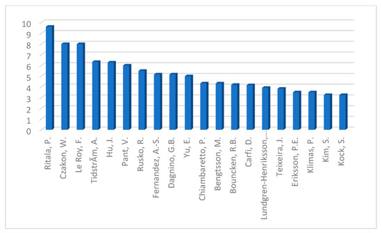 The concept of comparison of paper numbers to understand the input of authors into the field makes sense in the context of the calculation of bibliometric indicators. Full counting means that papers are counted as equal for the number of authors of the publication, as presented in Table 2. Fractional counting means that a co-authored publication is assigned fractionally to each of the coauthors, with the overall weight of the publication being equal to one. This methodology offered by experts in bibliometric analysis proved that fractional counting is more valid comparatively to full counting [42]. The data on fractional counting for each author were extracted via Bibexcel and presented the main contributors in the area of coopetition research as follows (please see Figure 4).