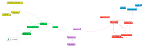 Visualization of research network may be accomplished with the help of VOSviewer, the program that has its own clustering technique [43], and due to this, two levels of analysis were performed as in Figure 5—clustering of the publications, and citation relations. As shown (see Figure 5), the distance between the clusters approximately indicates the relatedness of the clusters in terms of citations. As we may see, clusters that are located close to each other tend to be strongly related in terms of citations, and those clusters which are located further away from each other tend to be less strongly related.