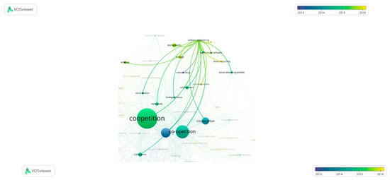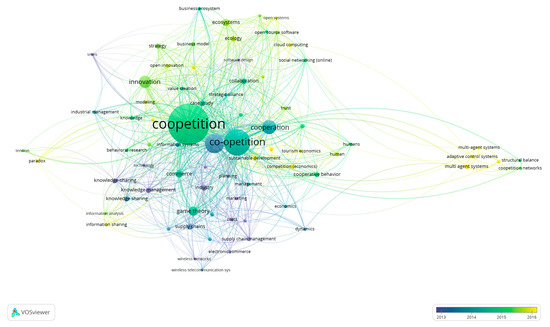 To reveal new trends and tendencies and, most important, further promising directions of the research, it is necessary to construct cluster analysis for the keywords, using the abstracts of papers extracted from the Scopus Database. VOSviewer is proven to be an effective tool for providing keywords visualization [41] which gives the analyst understanding of interconnections between main terms in a field of research. Using the abstracts of the chosen papers, the network of terms was generated by using a unique clustering technique offered via this program [43]. 80 keywords (frequency > 6) was identified which were refined to 75 by excluding duplicates and irrelevant for this analysis (i.e., “research”, “article” etc.). Therefore, 75 items were organized into 7 clusters, as showed below (please, see Figure 5 and Appendix A). It should be noted that the occurrence of the keyword “coopetition” is the highest and equals 323, the term “co-opetition” introduced by Branderburger and Nalebuff [8] is still popular, and its occurrence is 162, “competition” remains a widespread term in chosen papers as well as “cooperation” (100 and 63 accordingly). The top list is concluded by “innovation” (53 times) and “game theory” (33 times). The size of the circles reflects the occurrence of using the terms. Other items appeared in the sample less than 20 and more than 6 times. For chosen terms, network visualization (see Appendix A), overlay visualization (Figure 6) and density visualization were performed via VOSviewer. The overlay visualization is chosen as a more valid tool for verification of the recent trends in the academic field, as soon as it allows us to classify the items using timescale. The items are colored differently based on year of publication (average for the cluster). In our case, those terms that appeared recently (average year of publication is 2016) are more yellow. A color bar shown in the corner has the same explanation; the scores of the items are determined by the time since publication.