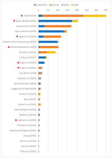 Keyword occurrence (full counting) for the chosen papers (N = 27) in a field of research, where red dots mark the papers from the Scopus Database. The ranking of papers is made according to the frequency of usage of keywords “coopetition”, “safety”, “security” and “cyber”.