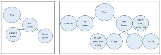 A model that incorporates a situation-dependent-identity would look more like Figure 7b above. The model on the right needs a lot more nodes to hold the same information. The structure of the model on the left makes it possible to get to a first answer quickly and efficiently (via automatic activation), with the possibility to obtain the rest of the knowledge when thinking more about it (system 2). The advantage of the model on the right however is that it is more noticeable when you do not know the answer in a specific situation, for example the color of leaves in fall, since there will be a blank node connected to that situation. In the model on the left, on the other hand, when you do not know the color of the leaves in fall, the bottom of the model will simply fall off and you can still answer the question ‘what color do leaves of trees have?’ without any empty spaces (see Figure 8).