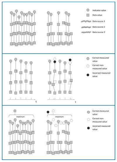 The left image (see top Figure 11) displays the ideal situation with continuous logging in which three variables are combined to create the indicator. In the situation on the right, some values are not logged leading to lower coverage in the indicator.