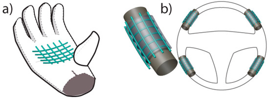 Figure 1 illustrates a pressure sensor for tracking a driver’s grip pressure in (a) a body-worn format, and (b) a vehicle surface format. Wearable sensors such as the glove in (a) are more practical for daily use than, for example, blood sampling to measure glucose [2] or cortisol levels, or neural implants to detect brain activity in animal studies. Such invasive sampling can validate conclusions drawn from proxy signals available at the body surface, but a sensor glove is better for daily wear from the user’s viewpoint. However, for this grip-tracking application, the driver would have to modify their behavior to put gloves on, would need to keep the gloves charged, and would need to initiate wireless communication between the gloves and the vehicle. For those reasons, the steering wheel format in Figure 1b is more practical than gloves for grip tracking. Measurements of other signals that vary with driver stress levels, such as pulse rate, skin surface temperature, and skin conductance, often rely on skin-to-sensor contact that cannot be guaranteed on vehicle surfaces—even a steering wheel, if the driver is wearing mittens. In this physiological-sensing realm, wearables are unparallelled. Previous reviews have carefully considered wearable sensors for driving safety [3], wearable sensors for emotion recognition [4,5], and combinations of wearable and in-car sensors for detecting driver drowsiness [6,7] and distraction [7,8].