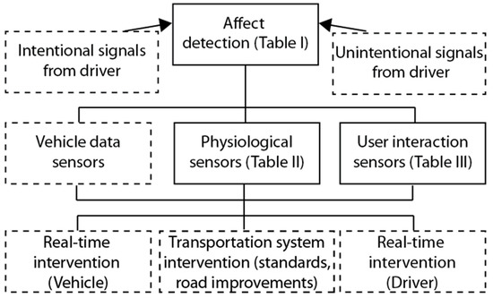 Figure 3 puts our review of affect detection (Table 1), physiological sensors (Table 2), and user-interaction sensors (Table 3) in context with the larger picture of driver behavior. A third category of sensors, vehicle data sensors, refers to braking, steering, acceleration and other mechanical signals available from vehicle computers. This sensor layer in the second row of the diagram is the link between driver behavior and possible safety interventions.