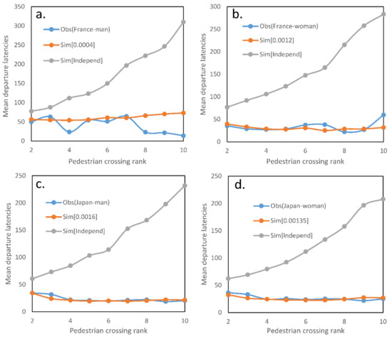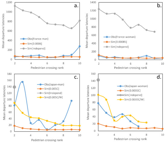 Crossings at the red light: although the number of pedestrians already crossing was sufficient to explain the departure latencies of French sites, the departure probability had to be modelled as dependent on in order to fit the simulations to observation data in Japanese sites (Table 3). While all the waiting agents crossed in the green-light model, some simulations for the red-light model were different, with the number of crossing agents sometimes stopping before the threshold of 10 was reached. This result was important to explain the data. The independence hypothesis was not confirmed, either because the distribution of simulated departure latencies was different from the observed data (p ≤ 0.00001, D = 1 for French pedestrians), or because the simulations only reached one follower in Japanese pedestrians, which is far from the result we obtained with observations (nine followers for Japanese men and seven followers for Japanese women). For French men, departure latencies of mimetic coefficients [0.0006; 0.0005] were not statistically different from observed departure latencies (p ≥ 0.126, D ≤ 0.556; 0.0006 being the best mimetic coefficient: p = 0.352, D = 0.444, Figure 2a). Concerning French women, distributions of simulated departure latencies with mimetic coefficients going from 0.0006 to 0.00085 are not statistically different from observed data (p ≥ 0.126, D ≤ 0.556), with a best mimetic coefficient of 0.00085 (p = 0.730, D = 0.333, Figure 2b). As previously noted, the number of pedestrians already crossing was not enough as a single process in our model to explain the departure latencies of Japanese pedestrians (p < 0.028, D > 0.722). However, the distributions of departure latencies in simulations that include the number of pedestrians already crossing and the number of waiting pedestrians (Table 3) are not different from the observed departure latencies (p ≥ 0.108, D ≤ 0.667), with 0.005 as the best mimetic coefficient for Japanese men (p = 0.860, D = 0.264, Figure 2c) and 0.0035 for Japanese women (p = 0.872, D = 0.285, Figure 2d).