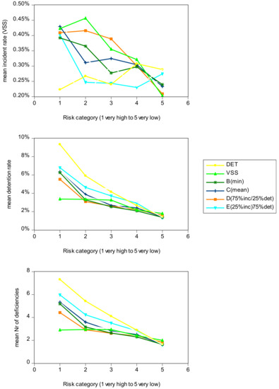 Incident rate (%), detention rate (%), and mean number of deficiencies per risk category.