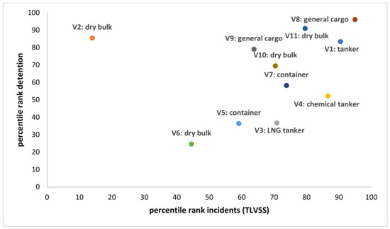 The use of percentile ranks makes it possible to combine two risk dimensions and allows customized benchmarking of vessels, for instance, by considering vessels for a specific country or region of interest rather than the global fleet used here. Since the percentile ranks are based on a benchmark sample which could be the global fleet or all vessels that arrived in a specific region over a time period (e.g., three or five years), the percentile ranks can be customized and are dynamic in nature since they automatically correct for improvements of the fleet since vessels are always compared against each other dynamically if the benchmarking routine is run daily or weekly. This approach is more dynamic to classify vessels compared to, for instance, just using an average detention rate that is used and not changed for many years.