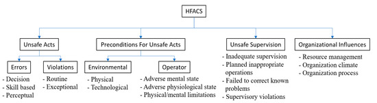 36]. The coding was undertaken by the second author, an aviation human factors academic for 14 years, and a former commercial pilot including single-pilot IFR (instrument flight rules) operations as well as flight instruction. The HFACS framework has four levels of failure, with categories and subcategories, as shown in