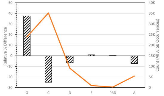 The other category includes 31 other manufactures, with a single manufacturer having at most 4 safety occurrences and an average of 2 occurrences per manufacture in this category. These were not included individually as the BITRE (Bureau of Infrastructure, Transport, and Regional Economics) annual report did not specify the hours associated with these manufacturers, and their associated hours were grouped in an “other” category. The airspace classifications used in Australia include A, C, D, E, and G. An additional airspace classification of PRD includes prohibited, restricted, and danger areas.
