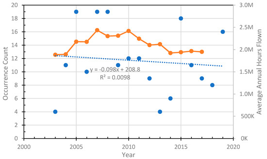 Since year is an interval variable, a suitable parametric test was needed to assess the trend and statistical significance. Specifically, correlation was used to measure if the number of VFR2IMC occurrences have reduced over the 17-year span of the study.