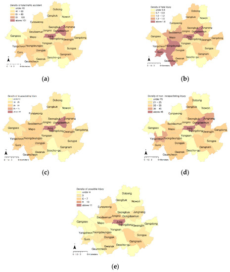 The present study was conducted using electronic crash data from pedestrian–vehicle collisions that occurred in Seoul, Korea, between 2013 and 2015. Over this three-year period, there were 33,106 accidents involving both pedestrians and vehicles. The electronic crash data were obtained at the borough level using the Traffic Accident Analysis System. At the time of the study, the population of Seoul was approximately 10 million, according to 2015 census data, and its land area was approximately 605 km2. The pedestrian–vehicle collisions examined in this study were classified into five categories—total pedestrian, fatal, incapacitating, non-incapacitating, and possible injuries—according to the severity of pedestrian injuries. To account for differences in the area for Seoul’s 25 boroughs, the number of pedestrian injuries by level of severity was converted into a density ratio—number of pedestrian collisions per square kilometer for each borough.