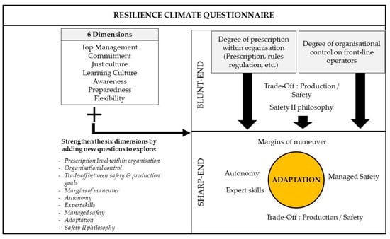 In terms of informing an instrument for measuring and benchmarking RE across the general industry, this review has identified that structured questionnaire surveys are the most common, which represents a way forward. However, given the discussions above, the terminology “Resilience Climate Questionnaire” better captures the key characteristics to be measured. Moreover, the choice not to add the word “Safety” to the title is justified because concepts of Resilience and Safety are not synonymous and may even be contradictory []. Avoiding any contradiction into the title of the instrument itself will make it clear the aim is not measure either safety climate or safety culture but to focus on resilience.
