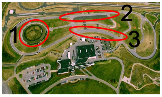 Aerial view of the track with the locations of the (1) skid recovery, (2) ABS braking, and (3) distraction exercises indicated.