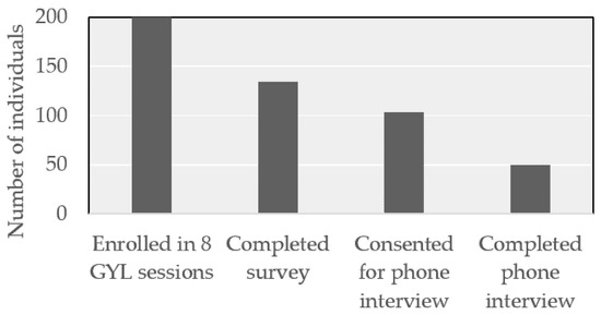 To be part of the Guard Your Life (GYL) Challenge program, teenagers must be between 15 and 19 years old and have a restricted or regular driver’s license. During the one-year study timeframe, eight half-day GYL sessions were offered and a total of 200 teenagers completed the program; see Figure 3. From this group, 134 teenagers completed the survey immediately after the program; participants included 72 males and 62 females, with an average age of 16.42 years (SD = 1.01). Of the 134 participants, 103 volunteered to be contacted for the follow-up phone interview. Fifty participants completed the follow-up phone interview, including 25 males and 25 females who ranged from 15 to 20 years, with an average age of 16.72 years (SD = 1.01).