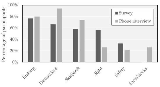 The data organization revealed that participants’ responses fell within eight topical areas, shown in Figure 9. The most frequent topical areas were skid/drift, sight, and braking. The most frequent topical areas from the phone interview were skid/drift, braking, and distractions. The survey responses were more focused on the technical aspects of driving such as “where to look” and “keeping control of the vehicle.” The phone interview responses focused more on the cognitive aspects of driving such as “knowing the dangers of driving” and “knowing how to deal with yourself in high-risk situations.”