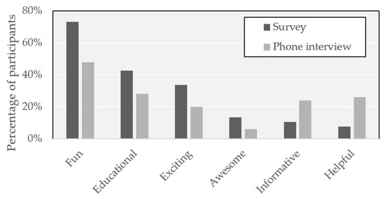 The top five key words were very similar between the survey and phone interview. Though the answers overlap, the survey responses reflected the raw emotions the teenagers experienced during the program including fun, exciting, and awesome. The interview responses focused more on the underlying meaning of the program such as informative and helpful. The graphical comparison between the survey and phone interview key words is shown in Figure 7.