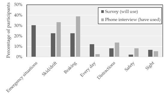 For those who responded with a “yes” on the survey or phone interview, follow-up questions asked for a description regarding what skills that they anticipate they will use (on the survey) or which skills that they actually used (on the phone interview). On the survey, when predicting future skills that they anticipate using, the responses fell into seven topical areas. One topical area was emergency situations, and responses included “being prepared and knowing what to do”. Another topical area was everyday situations, and an example response for this area included “using them anytime on the road.” Skid/drift responses from the survey predicting future use focused on knowing how to drive in the rain and respond appropriately when hydroplaning or sliding. The responses from the phone interview were about skills that they actually used since the program including recovering from a skid. Similar responses occurred with braking, where the survey indicated responses such as not being afraid to brake hard while the phone interview included specific instances of needing to brake suddenly on the road. Distraction responses from the survey focused on not being distracted in the future, while the phone interview responses provide more detailed examples of changes participants made to be less distracted, including ways of preventing others in the car from distracting them such as turning down the music. The topic of safety increased in frequency from the survey to the phone interview, where participants reported being more careful/cautious, and provided a greater distance to the vehicles in front of them. Sight or “looking where you want to go” was also a consistent response on both the survey and the interview. The topical areas for the responses on the survey and phone interview are displayed in Figure 10.
