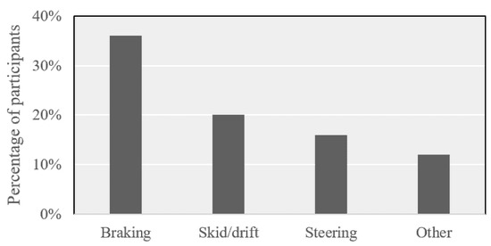 For each open-ended question, all of the participants’ responses were combined and sorted by grouping similar responses together, forming categories. These categories turned into topical areas—for example, the topical area of ABS braking contained responses such as brake hard, stomp on the brake and emergency braking. The number of responses for each topical area were tallied to determine the most common responses. There were often more topical areas from each question than what is represented in the most common response figures. To represent all topical areas and actual response language from the participants, word clouds were used. Word clouds are visual representations of large text-based data sets, where importance is represented by size [33]. All relevant words or phrases that participants responded with were entered into word clouds to present a visual representation of all topical areas, with the more frequent responses being larger.