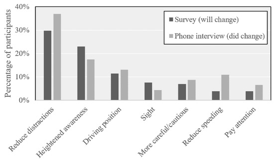Those that responded “yes” were asked to describe which behaviors they will change on the survey and which behaviors they did change during the phone interview. Response patterns from both the survey and phone interview were similar; see Figure 12. Reducing distractions was the most common topical area, followed by heightened awareness and driving position for both the survey and phone interview. Driving position included responses about seat adjustment, how to properly hold the steering wheel, and the process of getting prepared to drive a vehicle. Concerning the final four categories, there were differences observed between the survey and phone interview, where the survey responses focused more on the topical areas of both sight and being more careful/cautious, while the phone interview responses were focused on reducing speeding as well as paying attention.