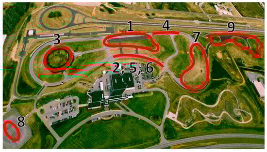 Locations of exercises on the closed-road track. The numbers correspond with the exercises described in Table 1.