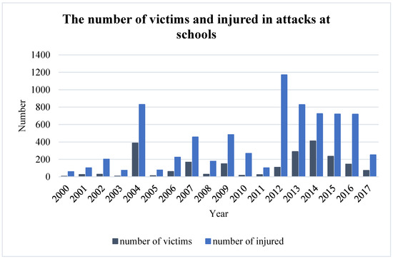 Given the high concentration of children in schools, the probability of them being hit and loss of life is very high. The number of victims and people injured in attacks at schools and school facilities between 2000 and 2017 is shown in Figure 3.