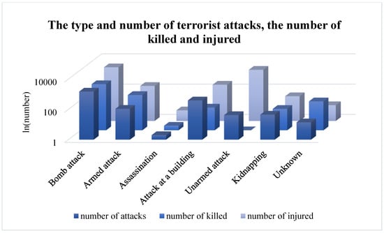A graphical comparison of the type and number of terrorist attacks, the number of killed and injured over the period 2000–2017 is shown in Figure 4. A logarithmic scale is used on the y-axis for a graphic reason.