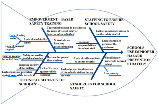 The stimuli and actions’ distressing effects or results of causes are graphically presented in Figure 6. The root cause of the problem was identified as the main problem—the schools use an improper hazard prevention strategy. As you can see, this problem grew from different factors: inadequate practical and theoretical training, lack of human resources, lack of appropriate technical security and lack of school building protection. Each factor is made up of at least a few reasons which helped to identify why the schools have had low security and developed poor hazard prevention processes. Additionally, it can be mentioned that the cause-and-effect diagram pointed out the ways how schools’ security problem can be mitigated and reduced.