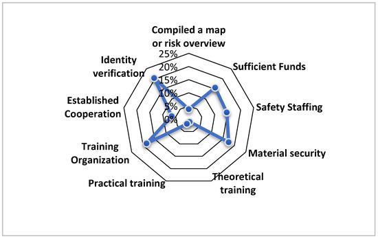 Additionally, the appropriate rank (from 1—the least-affecting to 9—the most-affecting) was assigned to each of preparedness lacking a cause depending on determined standardized weight (see Table 8). For the first graphical data analysis, we used the radar principle diagram, which is suitable to present individual data points signifying changes in values relative to the center point. In this case, the radar diagram was used to draw the standardized weight in percent for each of all lacks of schools’ safety (see Table 8), which were identified after 46 experts’ survey (see Figure 7).
