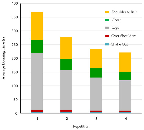 The precise mean times to complete each of the four repetitions are presented in Table 4 along with standard deviation (SD). Details are in Table S1 in the Supplementary Materials. The time to adjust the leg straps constituted the largest contribution to total time. The step taking the second most time was adjusting the shoulder straps. The graphical comparison used the stacked bar chart in Figure 4 to reflect the relative contributions of step times to the total time of each repetition. The stacked bars show a decreasing trend in total time.