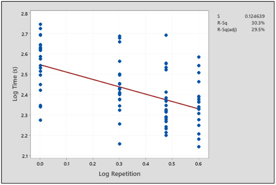 The second statistical part used regression analysis to determine the value of B in Equation (1). That involved regressing the log of T with the log of R. The scatter plot in Figure 5 showed a decreasing slope with increasing log R. It also shows a similar variance in the data of each repetition. The slope of the regression line (−0.3597) was later used as the exponent of repetition in Equation (1). The fitted line indicates a 22.1% decline with each doubling of repetitions.