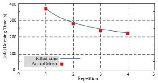 Four repetitions provided a quantifiable decreasing trend in time. The contrasts in Table 5 indicate significant differences in total time occurred between T1 and all subsequent repetitions. Differences between T2, T3, and T4 were not significant, but the learning curve plot in Figure 4 and Figure 6 show a decreasing trend from R2 through R4. If more repetitions were to be included in the training, the learning curve would predict a continued reduction in time; specifically, it would take four more repetitions to achieve an additional 22.1% reduction in time. In a work setting, extending the training beyond four repetitions would involve the cost of the coach and each trainee while yielding diminishing reductions in donning time, and for that reason, we consider more than four repetitions as being impractical.