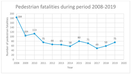 Pedestrians, along with cyclists and motor cyclists, are vulnerable road users. These are road users who are often seriously injured or killed in road accidents because they are unprotected against the speed and mass and they do not have effective safety features compared to other road users. The vulnerability of particular groups can be expressed through a vulnerability index. For example, in the case of a collision with a vehicle, we can calculate the pedestrian–vehicle crash vulnerability index by dividing the number of serious injuries of car passengers by the number of seriously injured pedestrians. The higher the resulting value of the vulnerability index, the greater the vulnerability of a given group of road users [