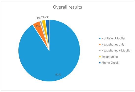 From the total number of pedestrians observed (20,285), 91% did not use the mobile phone at all at pedestrian crossings, 9% of pedestrians used headphones or mobile devices, which in absolute terms represents 1903 pedestrians, 4% used headphones, 1% used headphones and their mobile phone at the same time, 2% of pedestrians made phone calls and 2% of pedestrians also used the mobile phone at pedestrian crossings. On average, 23 pedestrians used headphones and mobile phones for each hour of the survey.